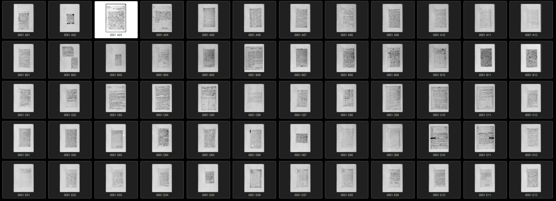 Ogni microscheda è costituita da un massimo di cinque righe di fotogrammi indicate con le lettere maiuscole dalla A alla E per un massimo di 12 colonne dalla 1 alla 12, come indicato nel modello di scheda d'esempio nella figura sopra. Qui sotto è mostrato l'esempio di una gallery di file con l'anteprima dei fotogrammi digitalizzati.