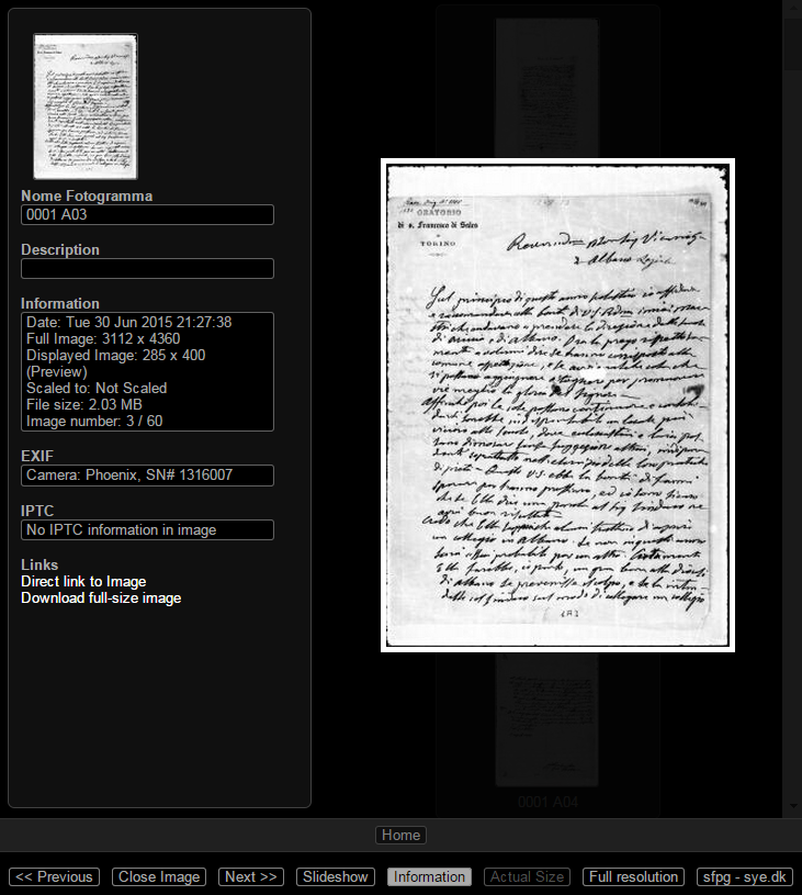 L'utente può con un click del mouse sul singolo fotogramma ingrandire (fare cioè uno zoom) e visualizzare informazioni e dettagli dell'immagine come è mostrato nello screenshot mostrato qui sotto. E' possibile sfogliare i fotogrammi con le frecce per andare avanti e indietro e rintracciare caratteristiche e tag del documento.